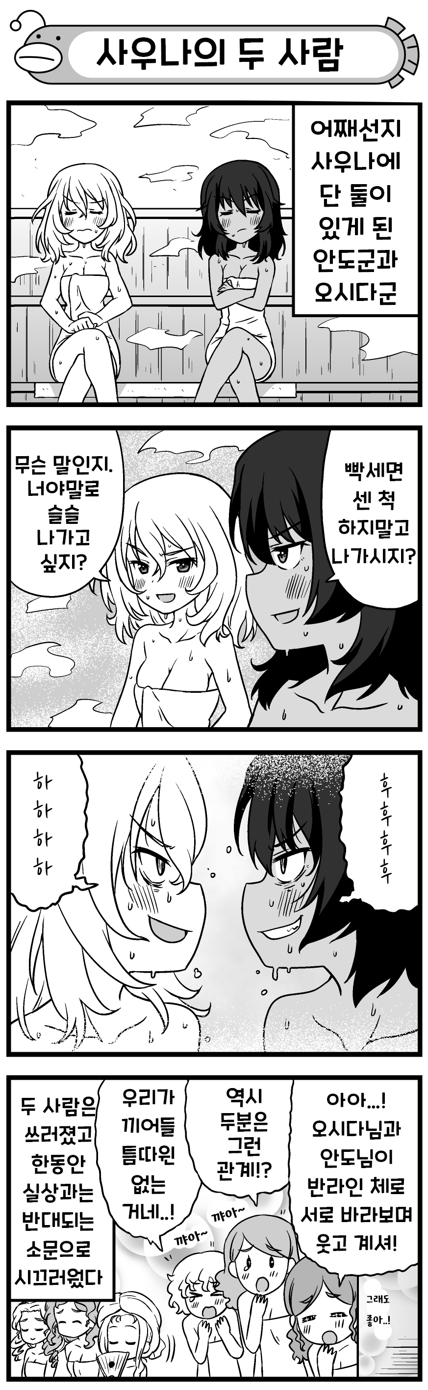 [걸판] 좀 더 러브러브 작전입니다! 554화 사우나의 두 사람 출처 : 걸즈앤판처 최종장 공식 홈페이지https://girls-und-panzer-finale.jp/giveout/ 配布コンテンツ|『ガールズ&パンツァー もっとらぶらぶ作戦です!』 WEB出張版|ガールズ& girls-und-panzer-finale.jp 554화 사우나의 두 사람 오시안도는 걸판에서 가장 우수한 커플링이며, 이것은 과학으로도 증명할 수 있다!(북극곰이 어쩌구) 만화 번역/걸즈앤판처 - 좀더러브러브작전입니다web 2024.08.12