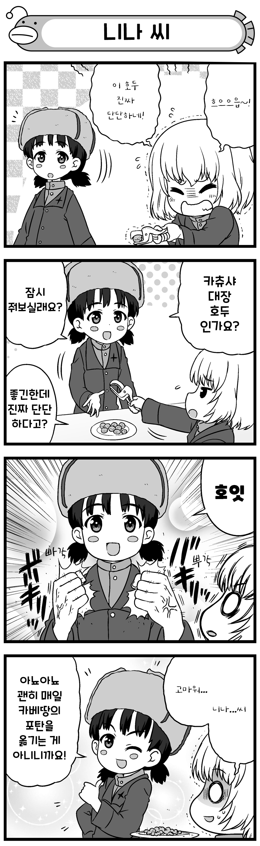[걸판] 좀 더 러브러브 작전입니다! 548화 니나 씨 출처 : 걸즈앤판처 최종장 공식홈페이지https://girls-und-panzer-finale.jp/giveout/ 配布コンテンツ|『ガールズ&パンツァー もっとらぶらぶ作戦です!』 WEB出張版|ガールズ& girls-und-panzer-finale.jp 548화 니나 씨다들 알겟지만 원래 카츄샤 대장은 반말캐릭이다 니나, 아리나는 이상한 시골 사투리 쓰는데 한국어 사투리 일절 몰라서 느낌 살리는 번역 무리 니나가 타는 카베땅이 152mm포 ㄷㄷㄷ 만화 번역/걸즈앤판처 - 좀더러브러브작전입니다web 2024.07.12